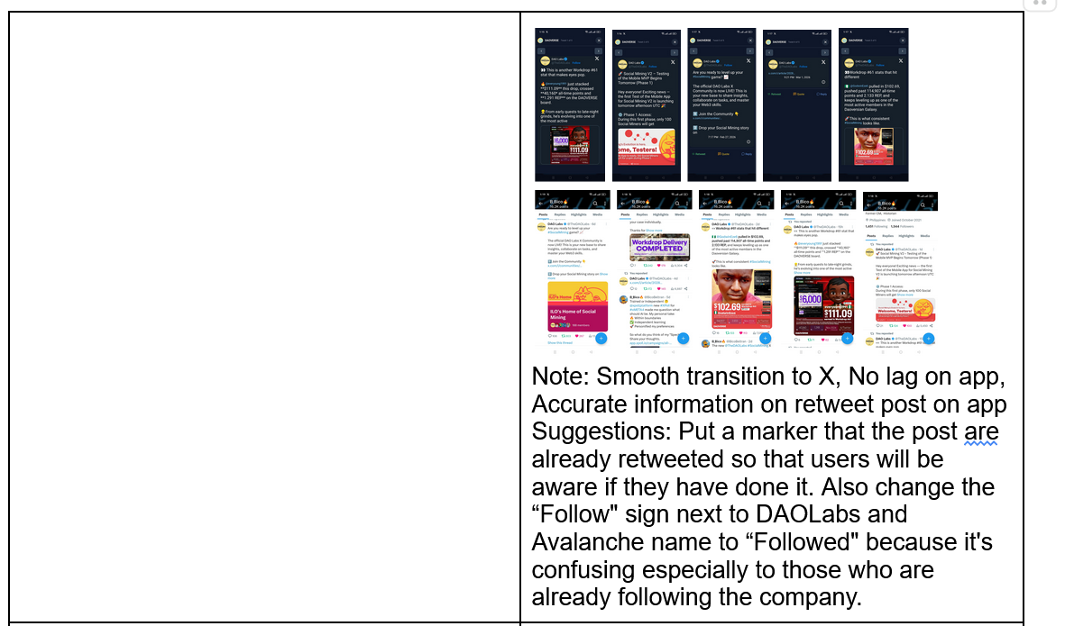 - Retweet: Retweeted 5 of 5 DAOLabs Post. Note: Smooth transition to X, No lag on app, Accurate information on retweet post on app. Suggestions: Put a marker that the post are already retweeted so that users will be aware if they have done it. Also change the “Follow" sign next to DAOLabs and Avalanche name to “Followed" because it's confusing especially to those who are already following the company.