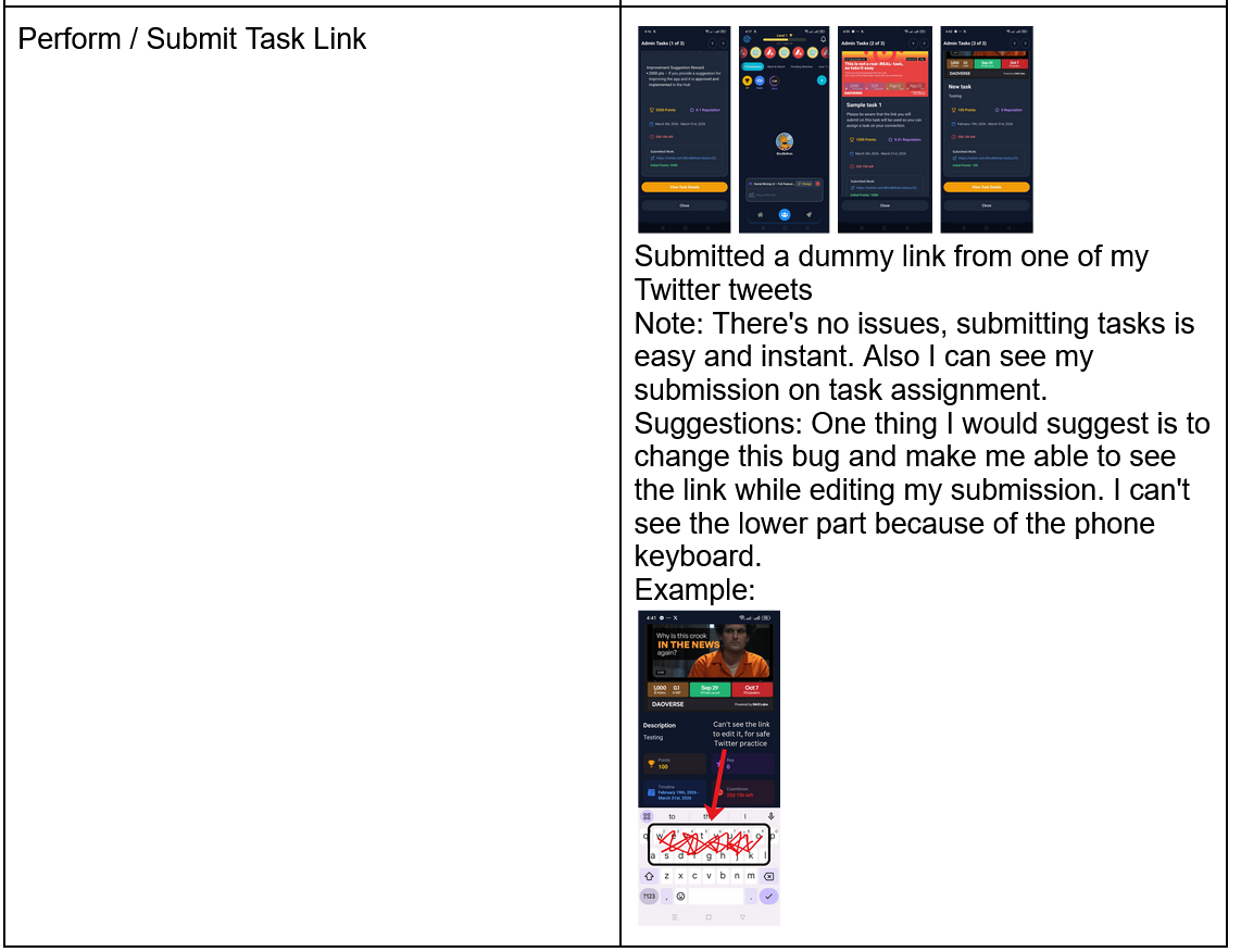 - Perform / Submit Task Link: Submitted a dummy link from one of my Twitter tweets. Note: There's no issues, submitting tasks is easy and instant. Also I can see my submission on task assignment. Suggestions: One thing I would suggest is to change this bug and make me able to see the link while editing my submission. I can't see the lower part because of the phone keyboard.