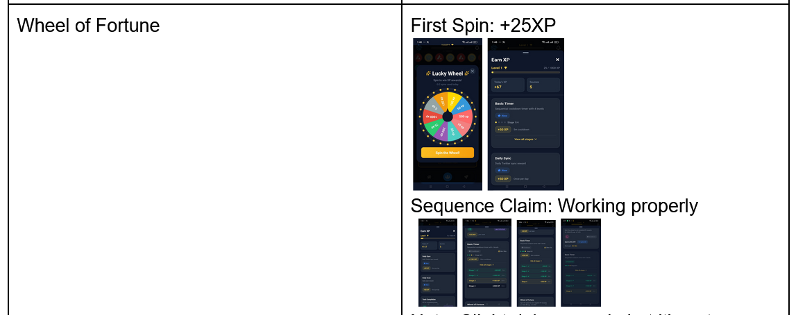 - Wheel of Fortune: First Spin: +25XP Sequence Claim: Working properly. Note: Slight delay on spin but it's not noticeable. Overall it's working properly and I'm gaining XP as the number suggested. While the claim event is doing as well, no bugs found and I'm getting the right XP as per the instructions. The timer is also right in the following sequences. So far so good. Suggestion: It would be awesome if we put notification alerts on the app not just on spin and claim but on tweets and task announcements as well.