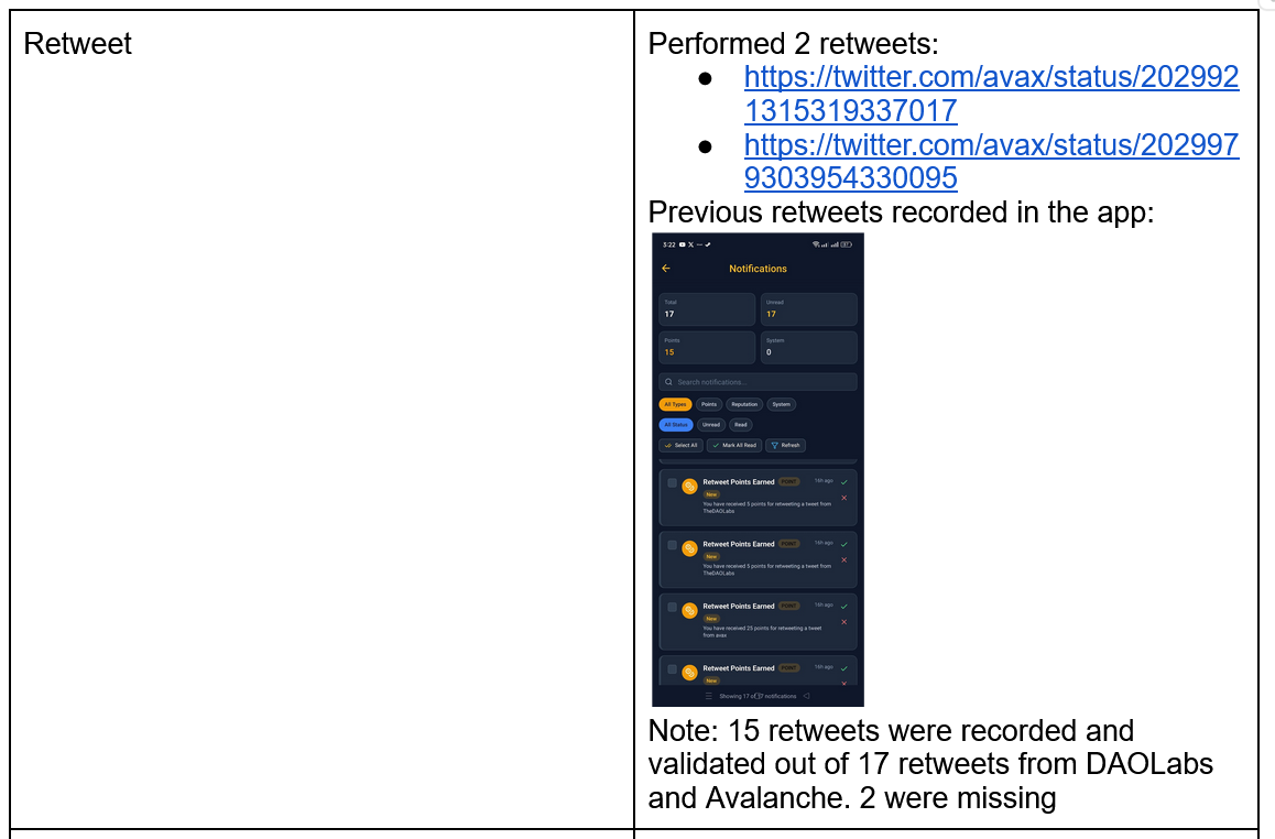 - Retweet: Performed 2 retweets (links provided). Previous retweets recorded in the app: 15 retweets were recorded and validated out of 17 retweets from DAOLabs and Avalanche. 2 were missing.