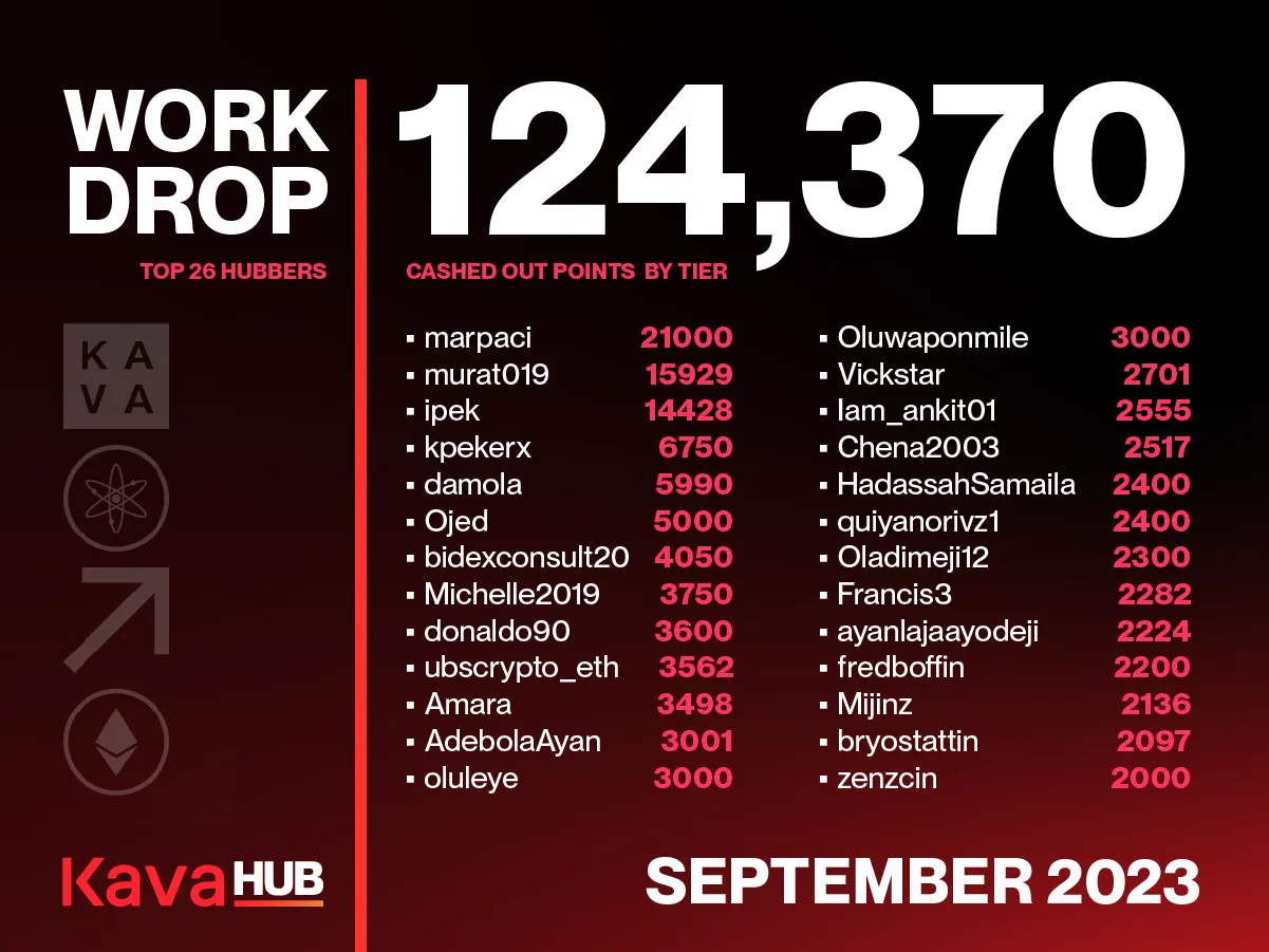 Around June of the same year, Kava Marketing representatives acknowledged the great contribution of the Hub to the Kava brand on X, making a powerful push to this L1 network’s footprint on the broad ecosystem. Later, in September, the Top 26 Kava Hubbers skyrocketed the point count to a new record: 124,370 points awarded in activities in a single month. And after that, new additions to the KAVA ecosystem, like Kinetix and Hover made the participation grow even more.