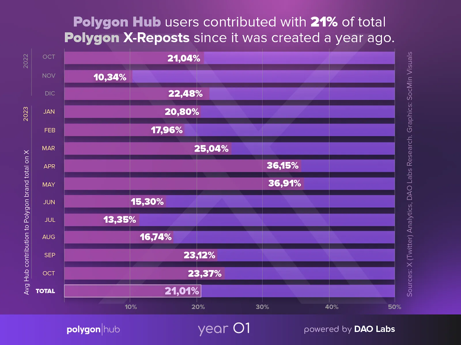 On how important the Social Mining Workforce is for these projects became evident on Polygon Hub. After a year of full functions, this collective became the number one single origin community devoted to promote and uphold Polygon and its ecosystem’s projects with 21% of this brand’s engagement on X. On average, 1 out 5 reposts on X about Polygon was made by a member of this Social Mining Community!